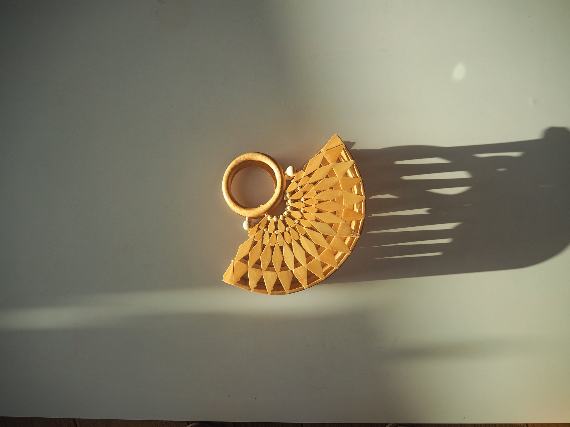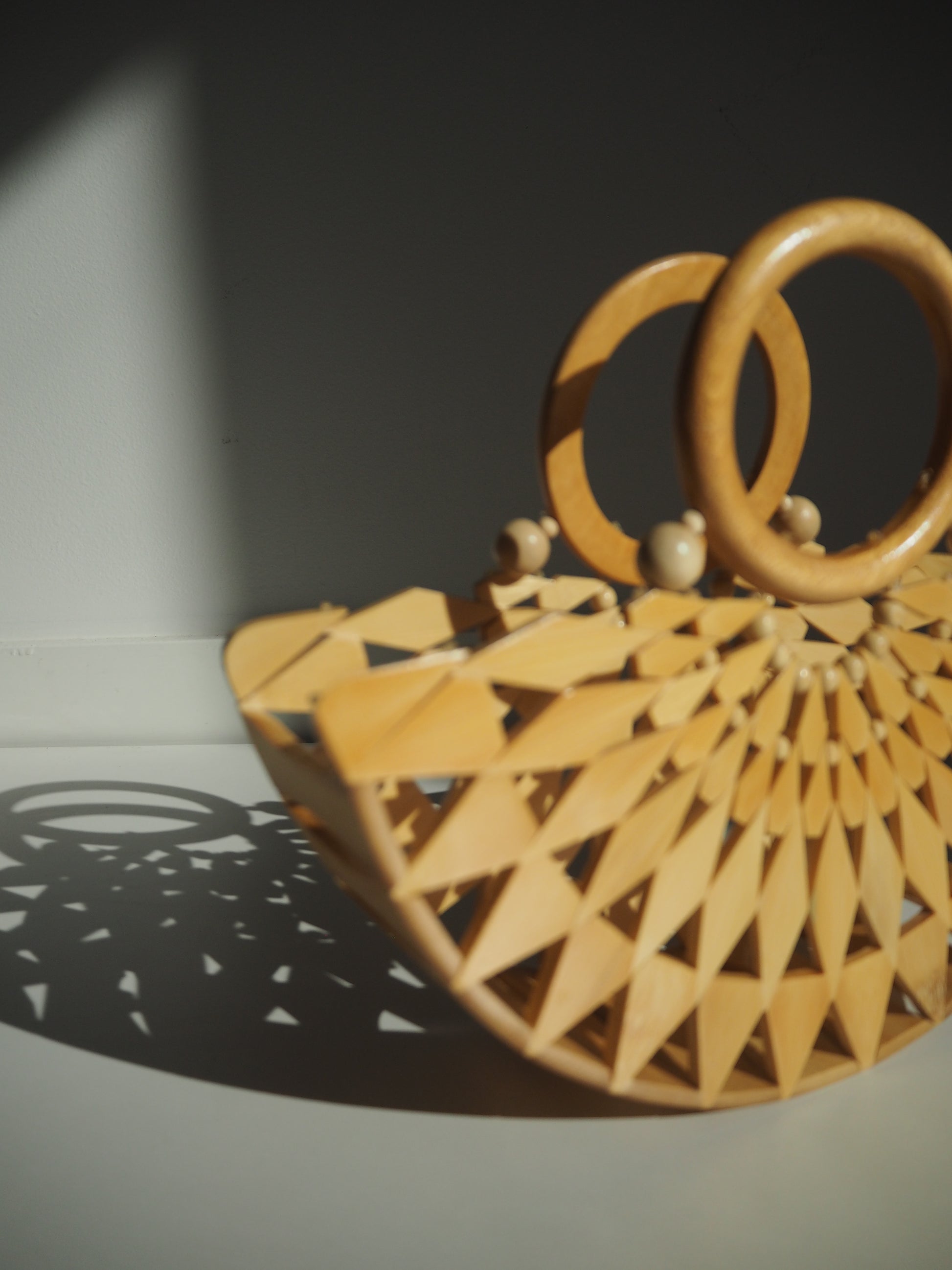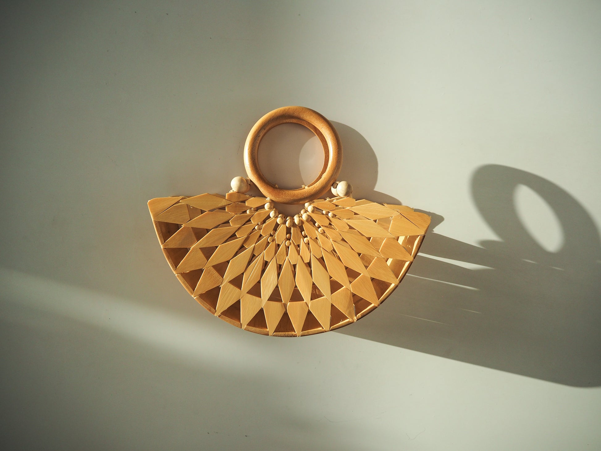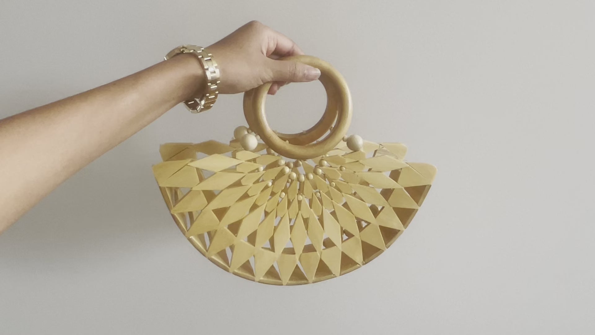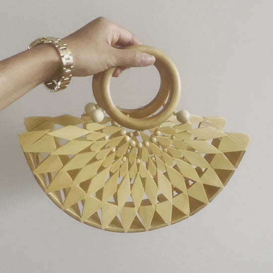 Constructed of open-weave bamboo slates with wooden handle, this bag offers stunning shapes, texture and a sense of luxury.